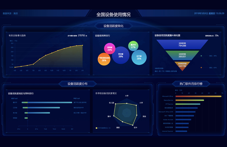 教育信息化应用数据看板可展现全国及各区域信息化建设成果,系统自动采集老师及学生在教学管理过程中产生的各项数据,并通过智能分析、可视化呈现,让用户清晰了解全国或当地教学信息化的进程;对比不同区域间的差别,推动教育信息化建设不断前进。