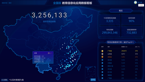 教育信息化应用数据看板汇集全国数十万间教室、数百万位老师的教学数据,可清晰呈现区域内信息化建设的整体状态。用户可通过数据看板了解区域内信息化建设的整体状态,把握教育信息化的发展趋势,更好地提出决策与改善建议。