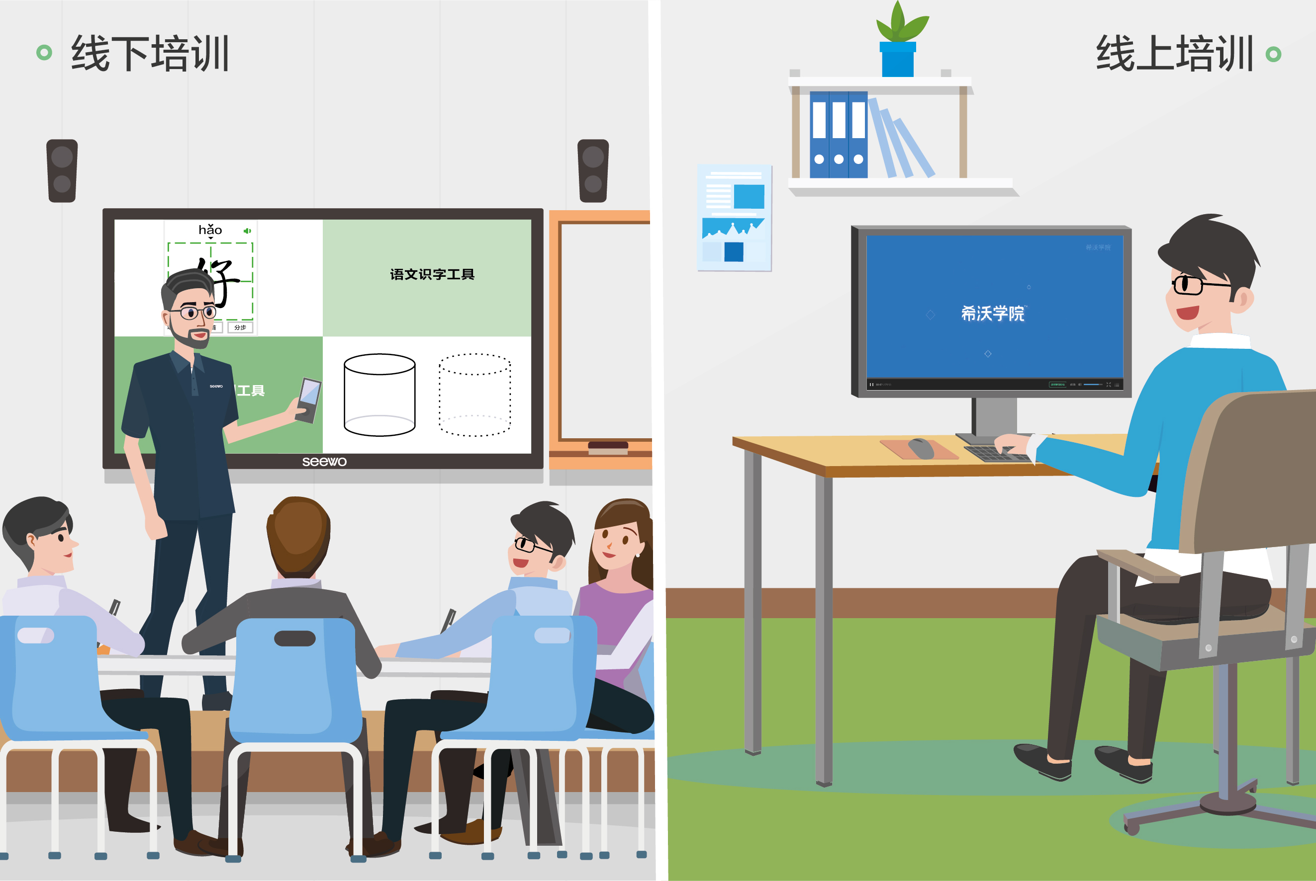 希沃教师培训提升方案,分为线上与线下两种培训方式。 线下培训:由希沃金牌讲师、各地教学名师到当地,现场对教师进行信息化教学培训,培训内容主要为互动软件、信息化教学硬件使用等。培训结合实际应用案例进行知识点的传授,让教师更易懂。同时,按内容难易分为初级、中级、高级等层级,为对信息化教学熟悉程度不同的教师进行定制化培训。 线上培训:搭载在希沃学院、各地网络学习课程平台进行。教师可利用闲散时间,针对自己感兴趣/想要提升的信息化教学内容、技巧进行自主学习。