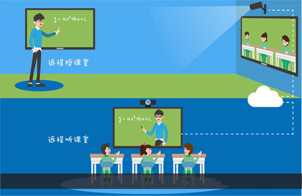 通过配备摄像头、麦克风等设备的课室,老师即可将教学过程的声音、视频、课件同步传输到其他地区的教室,使不同课室的学生能同时接受到优质的课堂,而通过教室摄像头传回的画面,老师还可实时观看异地课堂学生的上课情况,实现远程双向的互动教学。